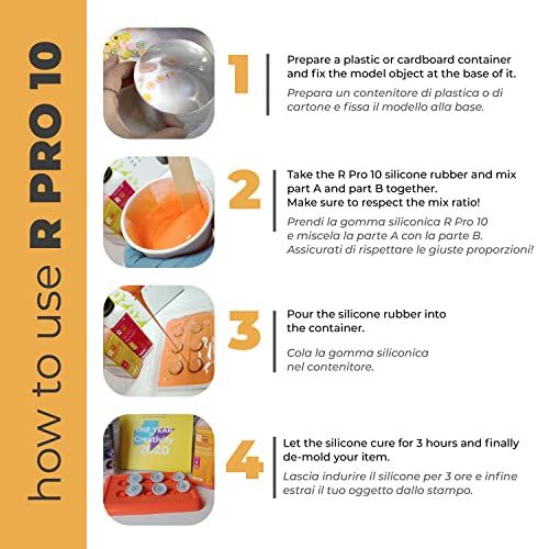 ✔️HAUTE PERFORMANCE: le caoutchouc de silicone R PRO 10 reproduit fidèlement tous le détails, même les plus petits et vous permet de faire le 15% de pièces en plus par rapport à d’autres caoutchoucs de silicone. Les moules n’ont pas de retrait linéaire. Durée de vie en pot: 45 minutes – Temps de durcissement: 3 heures. C’est un caoutchouc très fluide qui garantit un mélange facile et n’a pas besoin d’être dégazé avec des machines à vide.